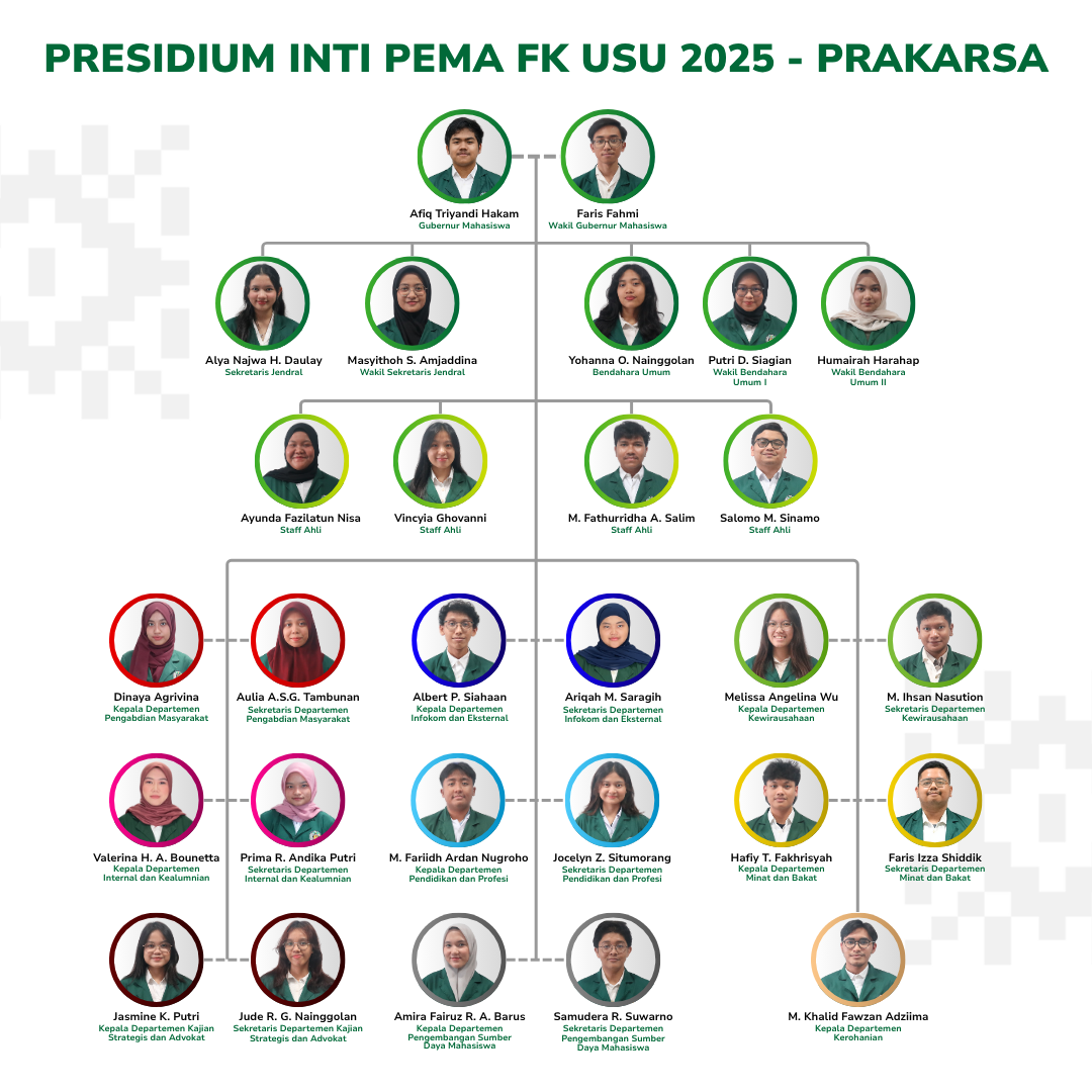 PEMA FK USU (Pemerintahan Mahasiswa Fakultas Kedokteran Universitas Sumatera Utara) merupakan organisasi kemahasiswaan tertinggi di Fakultas Kedokteran USU. Melalui visi dan misi PEMA FK USU, kami berkomitmen untuk menumbuhkan kepemimpinan, dedikasi, dan kreativitas. Dengan rasa tanggung jawab yang kuat terhadap masyarakat dan bangsa, PEMA FK USU menjadi ruang bagi mahasiswa untuk tumbuh bersama, menjunjung tinggi nilai-nilai Pancasila, dan berkontribusi untuk masa depan kesehatan yang lebih baik.